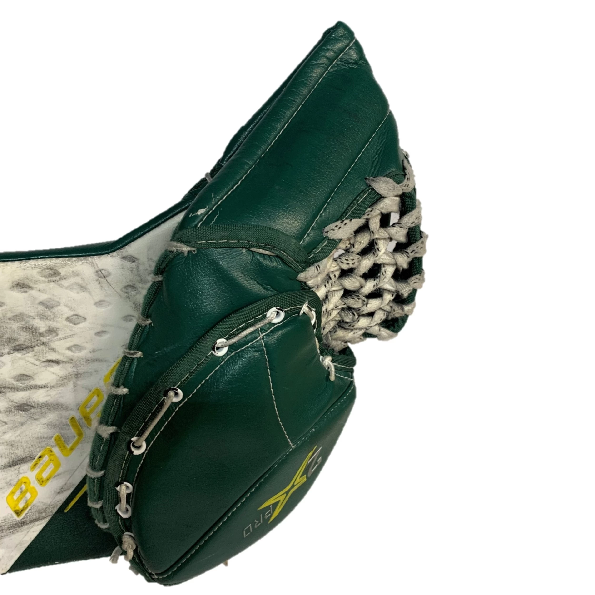 Used Bauer 2X Pro glove from an NCAA team. White/Green/Yellow. Glove is in good used condition with a decent amount of use and has a double T pocket.