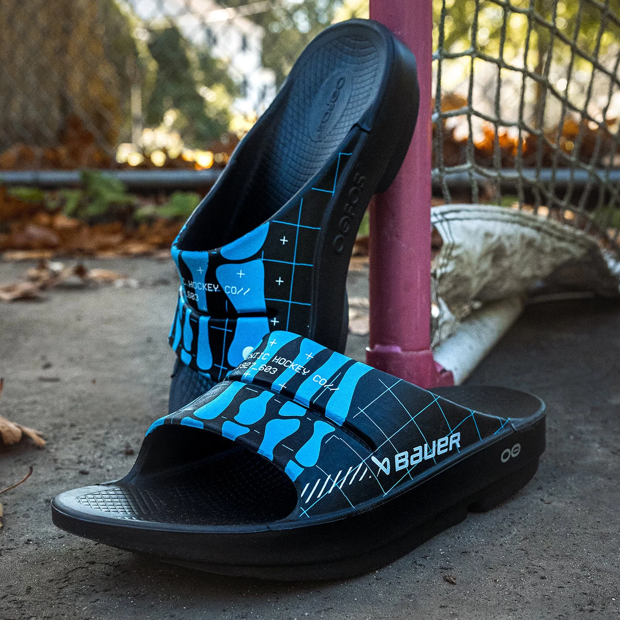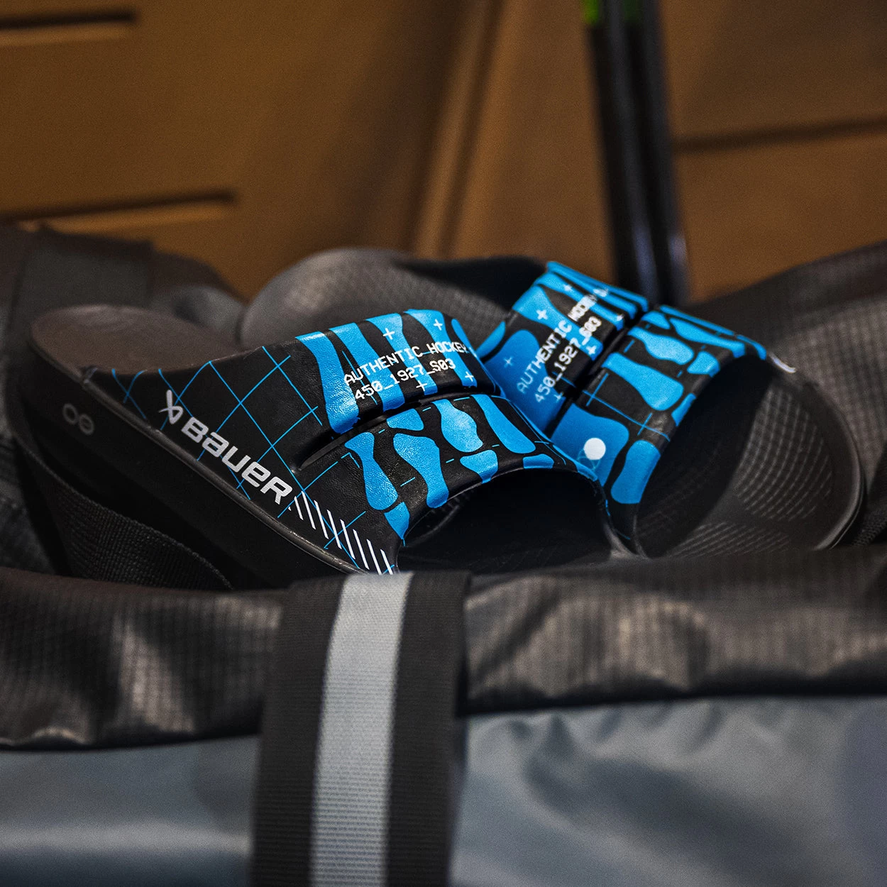 The BAUER | OOFOS Sandal may run small. If you are between sizes, we recommend sizing up. Easy to slide on and off between ice time or training sessions, this sport slide features OOfoam™ technology and a patented footbed for additional support. This unique foam technology absorbs impact, so your body doesn’t have to – helping you get back for your next game.