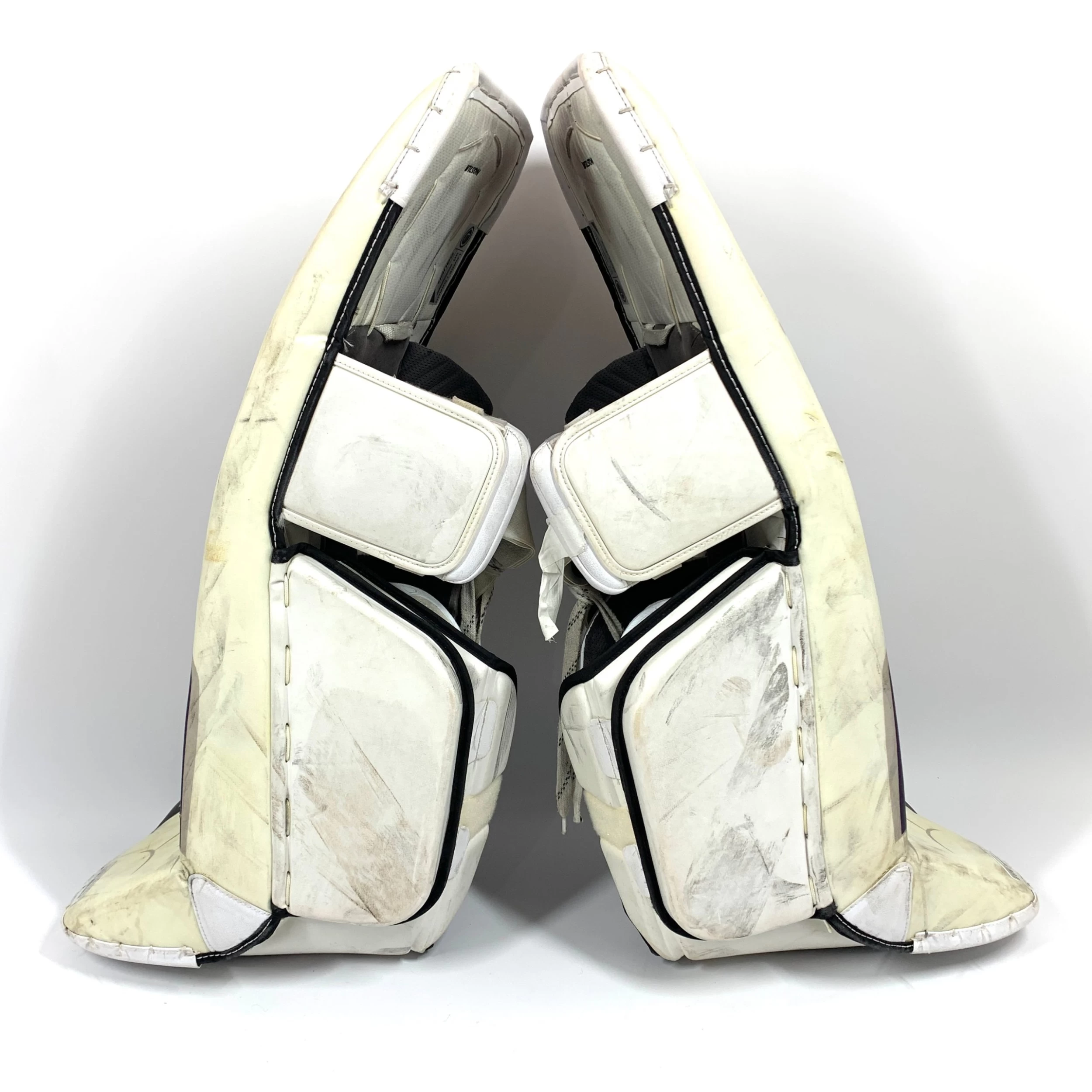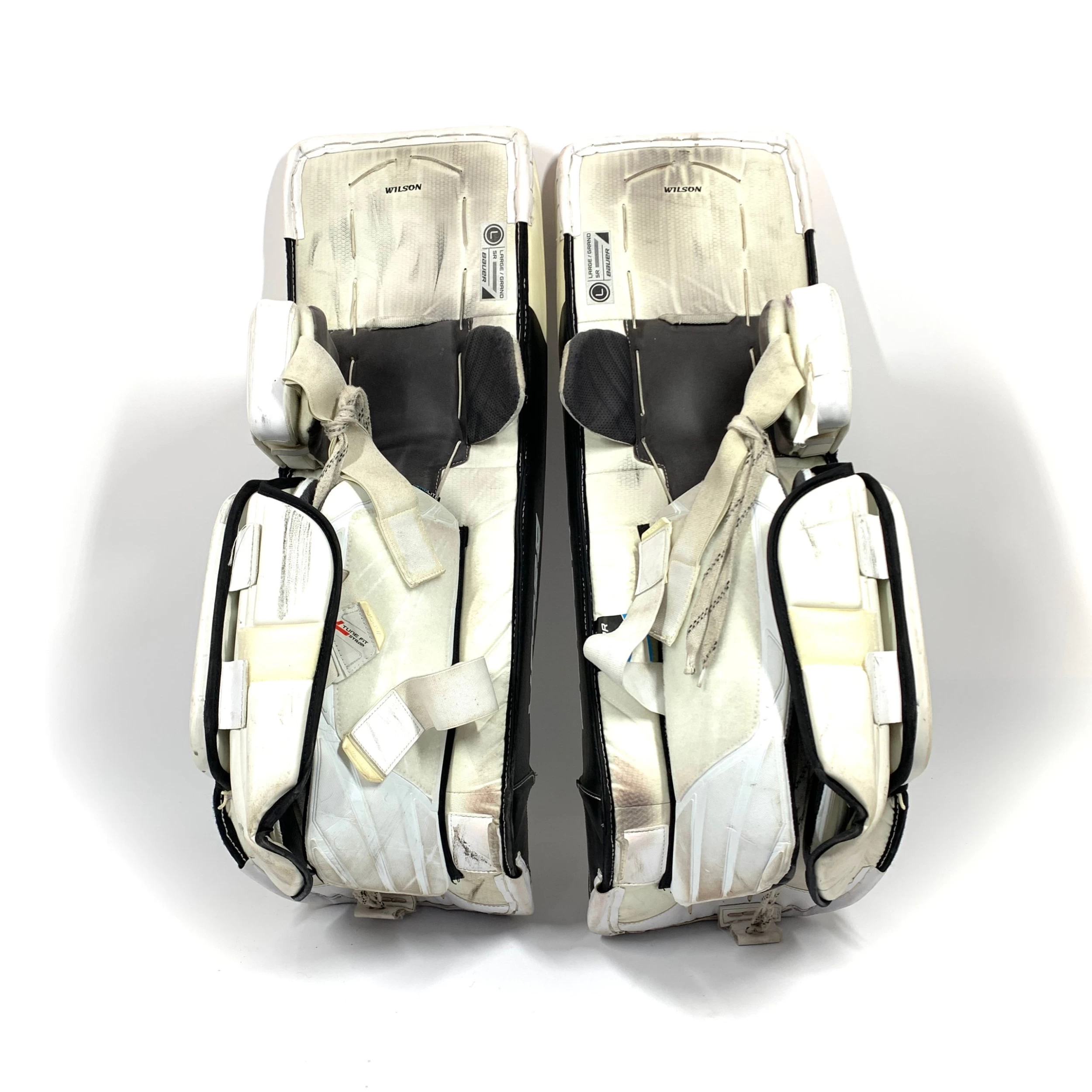 Used Bauer 2S Pro pads from an NCAA team. Bauer size Large. Some Vapor features. Pads are in good used condition, with some puck marks but overall great shape. There are a few small cuts (worst pictured) as well as a small tear on the outside of each boot break (pictured). Some letters are starting to peel on the Bauer logo. All straps/buckles/velcro are intact and in good shape.