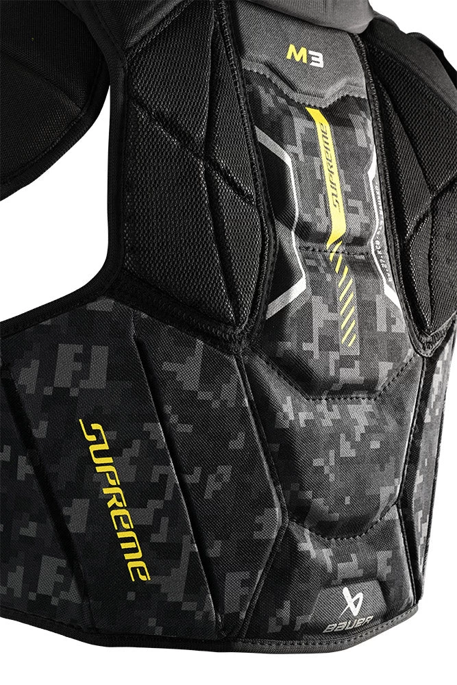 The M3 shoulder pads are the third model in the 2023 Bauer Supreme lineup and deliver great mobility and protection for the competitive level player. Building on the performance of the previous generation 3S shoulder pads, the new M3 model integrates a floating sternum and adjustable biceps which provide more impact protection and enhanced flexibility.