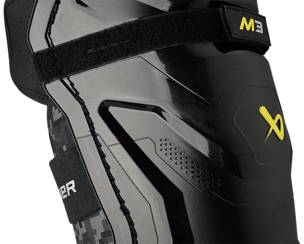 The M3 shin guards are the third model in the 2023 Supreme lineup and deliver great impact protection and an optimized skating stride for the competitive level player. Building on the performance of the previous generation 3S shin guards, the new M3 model integrates the new Supreme X-FLEX Shield with a full coverage calf guard which provides improved mobility and impact protection.