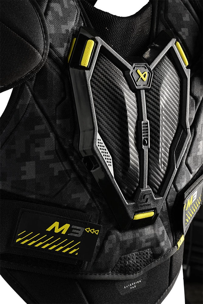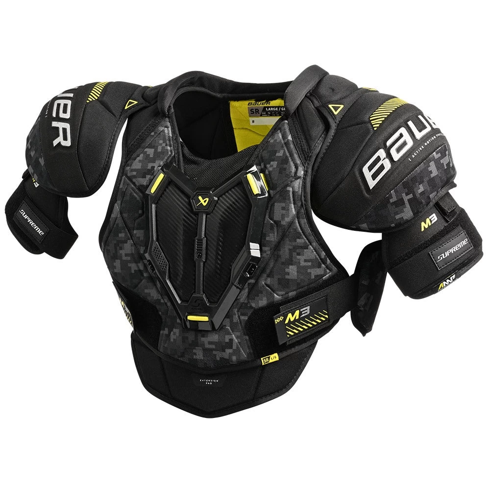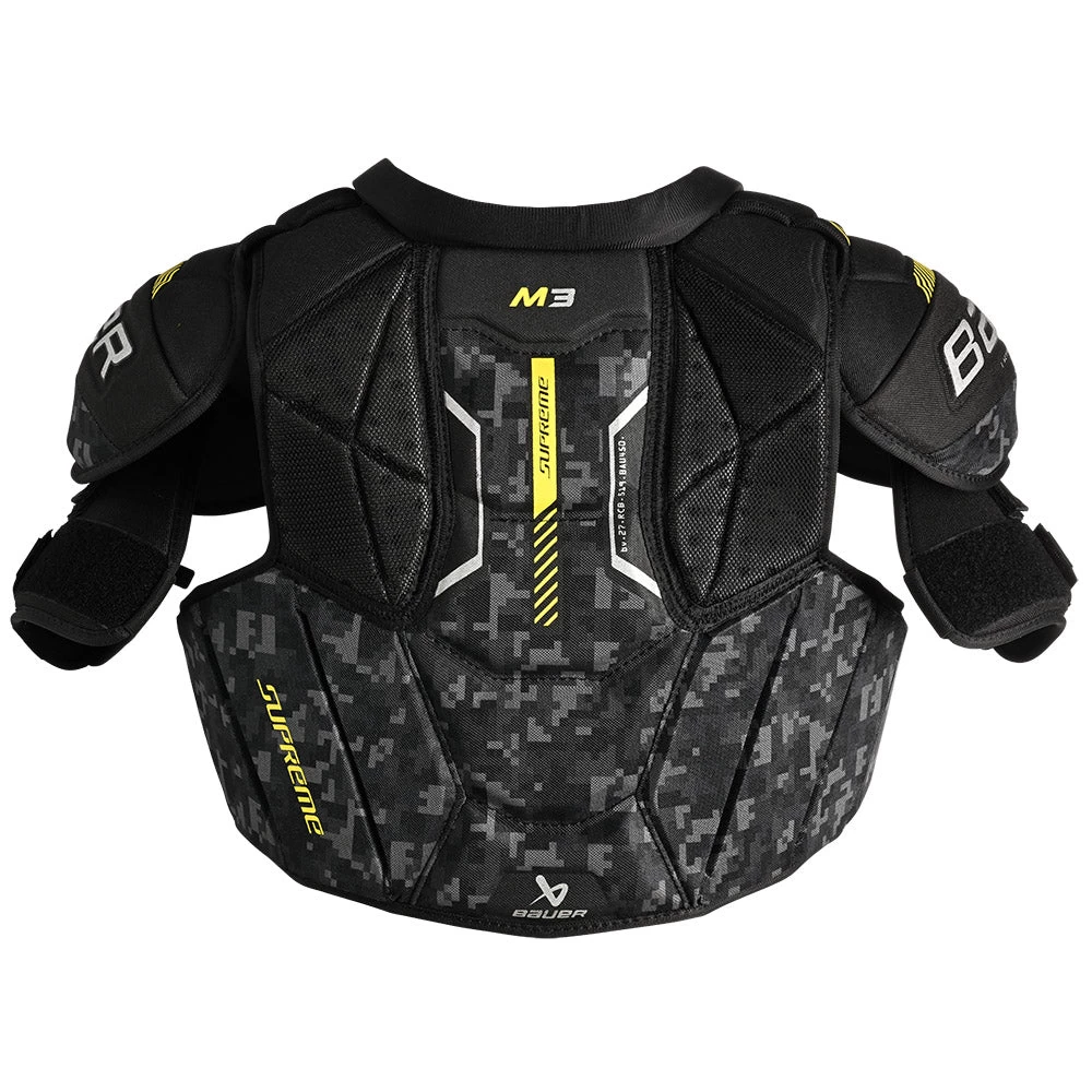 The M3 shoulder pads are the third model in the 2023 Bauer Supreme lineup and deliver great mobility and protection for the competitive level player. Building on the performance of the previous generation 3S shoulder pads, the new M3 model integrates a floating sternum and adjustable biceps which provide more impact protection and enhanced flexibility.