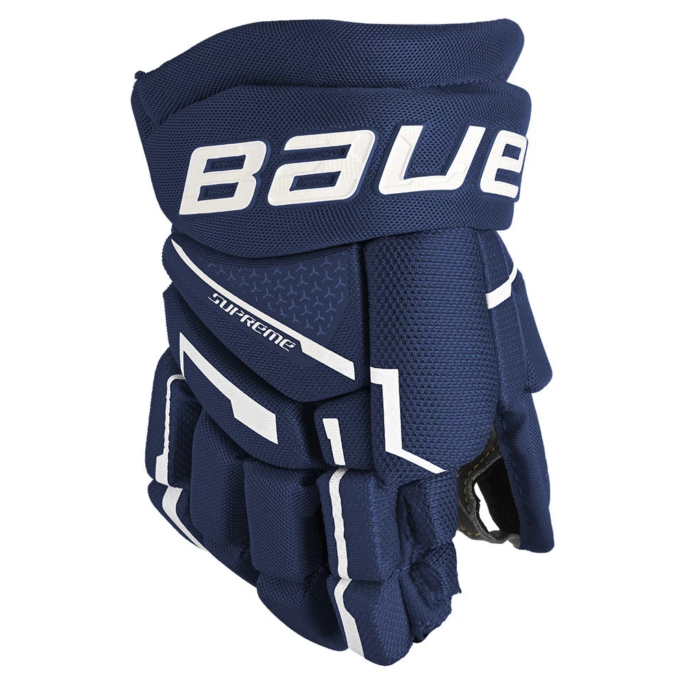 The Mach ice hockey glove is the top model in the 2023 Bauer Supreme lineup and delivers maximum mobility and protection for the elite level player. Building on the performance of the previous generation Ultrasonic glove the new Mach integrates a mid density foam backhand with a CONNEKT palm which provides comfort and protection.