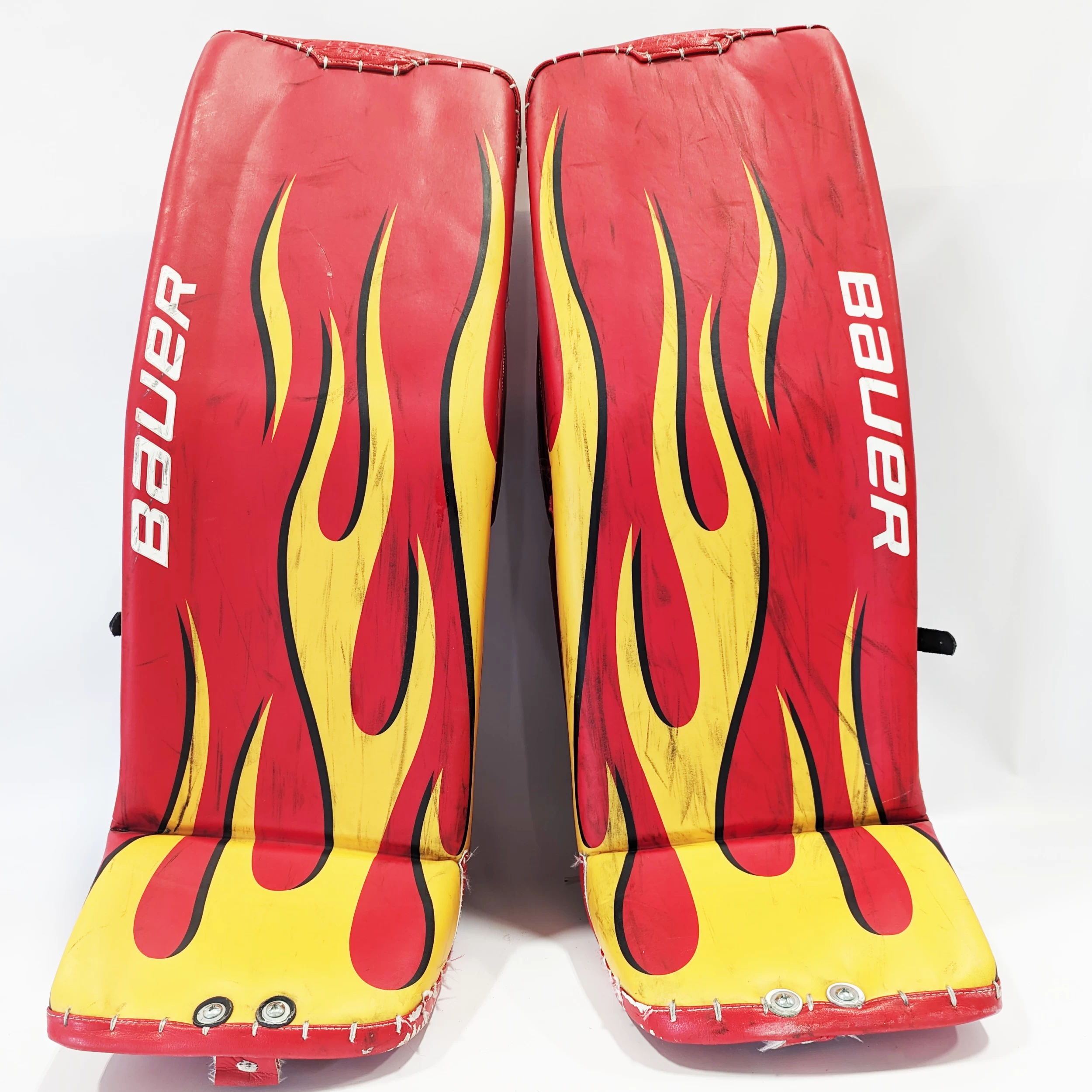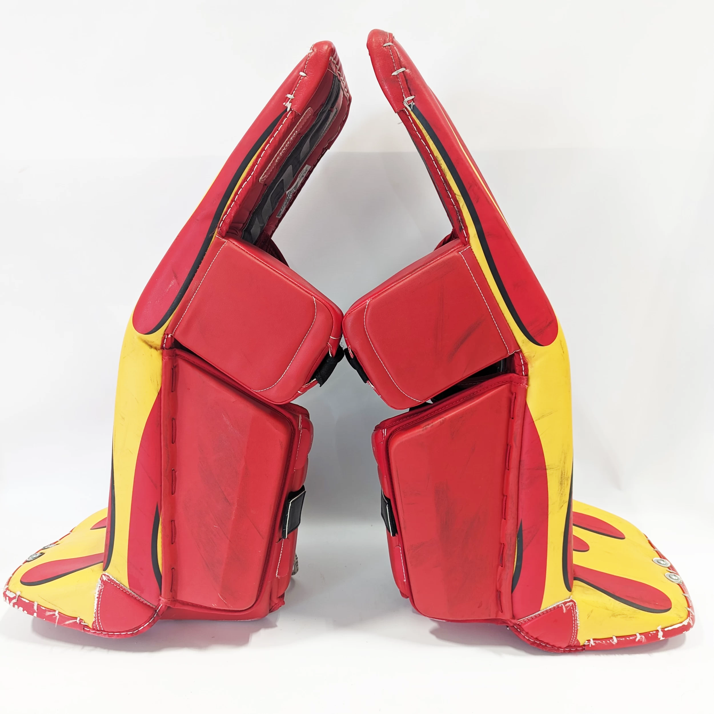 These are a pro stock set of used goalie pads from the Stockton Heat, formerly of the AHL. Other than some minor puck marks, the leather is in great shape. All straps are in working condition, but one the pads is missing a boot strap (pictured).Â
