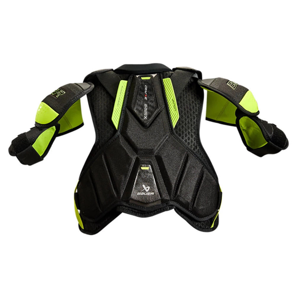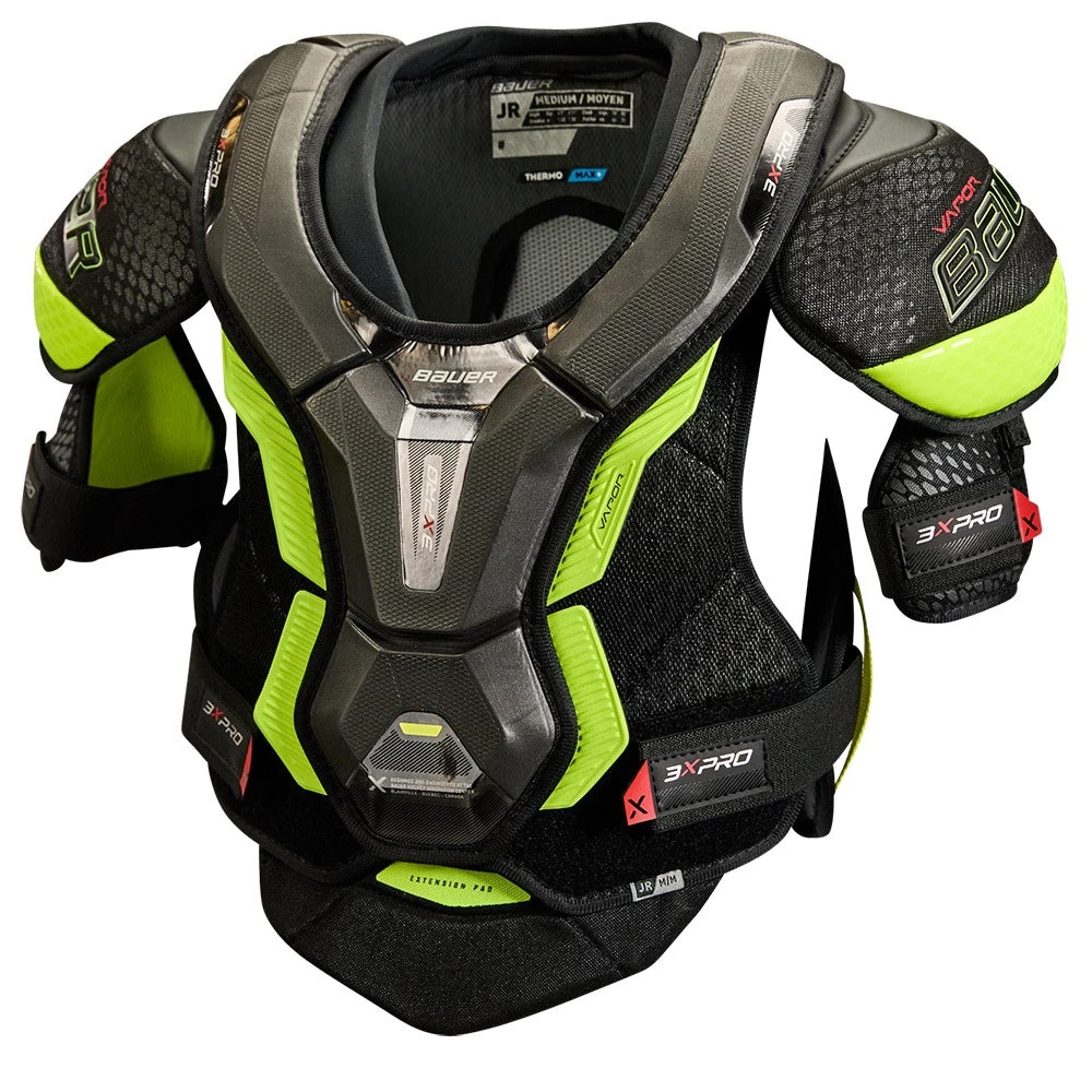 Bauer’s Vapor 3X PRO shoulder pad delivers elite level protection at an incredible value. AEROLITE cap technology brings the lightest option to this price point. The floating sternum on top of the VENTAPRENE vest allows for more movement and flexibility on the ice, while the spine protection combined with extended rib wrap gives you even more protection.