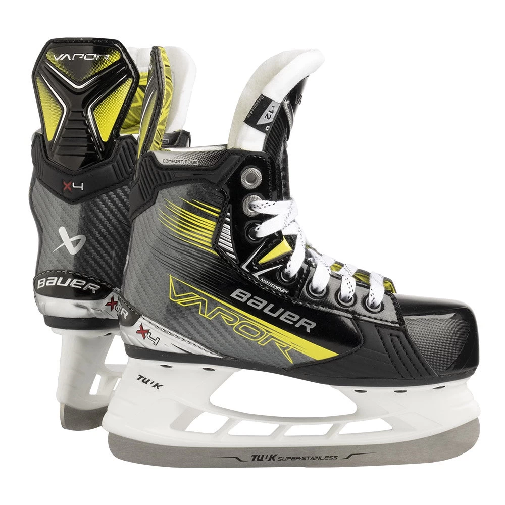 The X4 youth ice hockey skate is the second youth model in the 2023 Bauer Vapor lineup and delivers great speed and acceleration for the performance level player. Building on the performance of the previous generation 3X skate, the new X4 model integrates motion flex facing with memory foam ankle padding for improved comfort and fit.