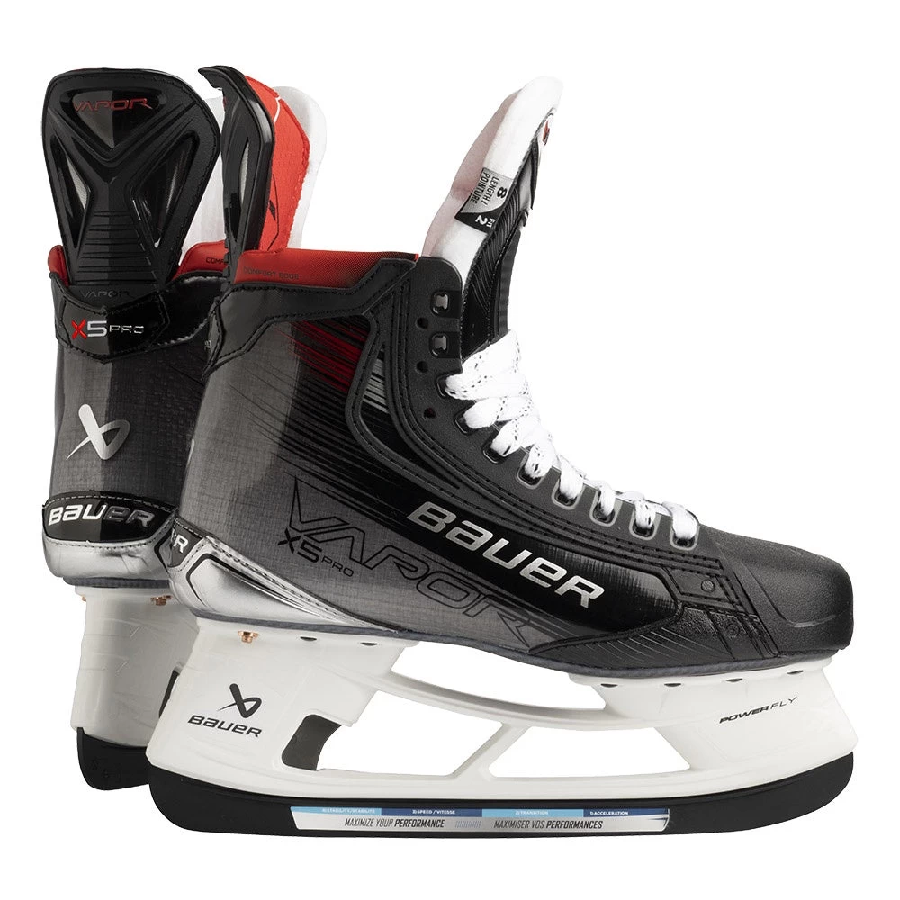 The X5 PRO ice hockey skate is the second model in the 2023 Bauer Vapor lineup and delivers amazing speed and acceleration for the performance level player. Building on the performance of the previous generation 3X Pro skate, the new X5 PRO model integrates 3D lasted CURV composite with the new Powerfly holder and Fly steel which provides more responsive turning and edging as well as a more secure and durable connection between the blade and holder.