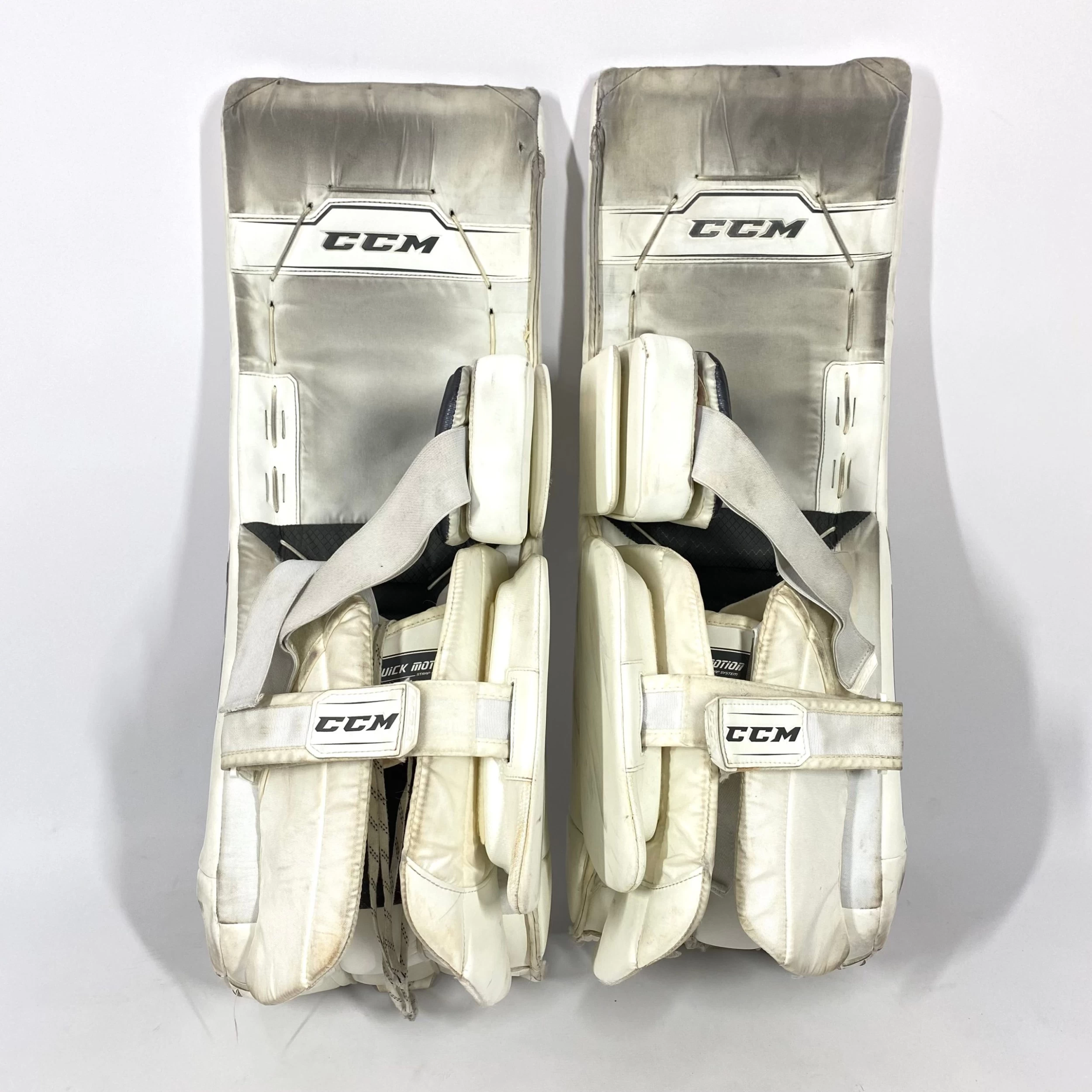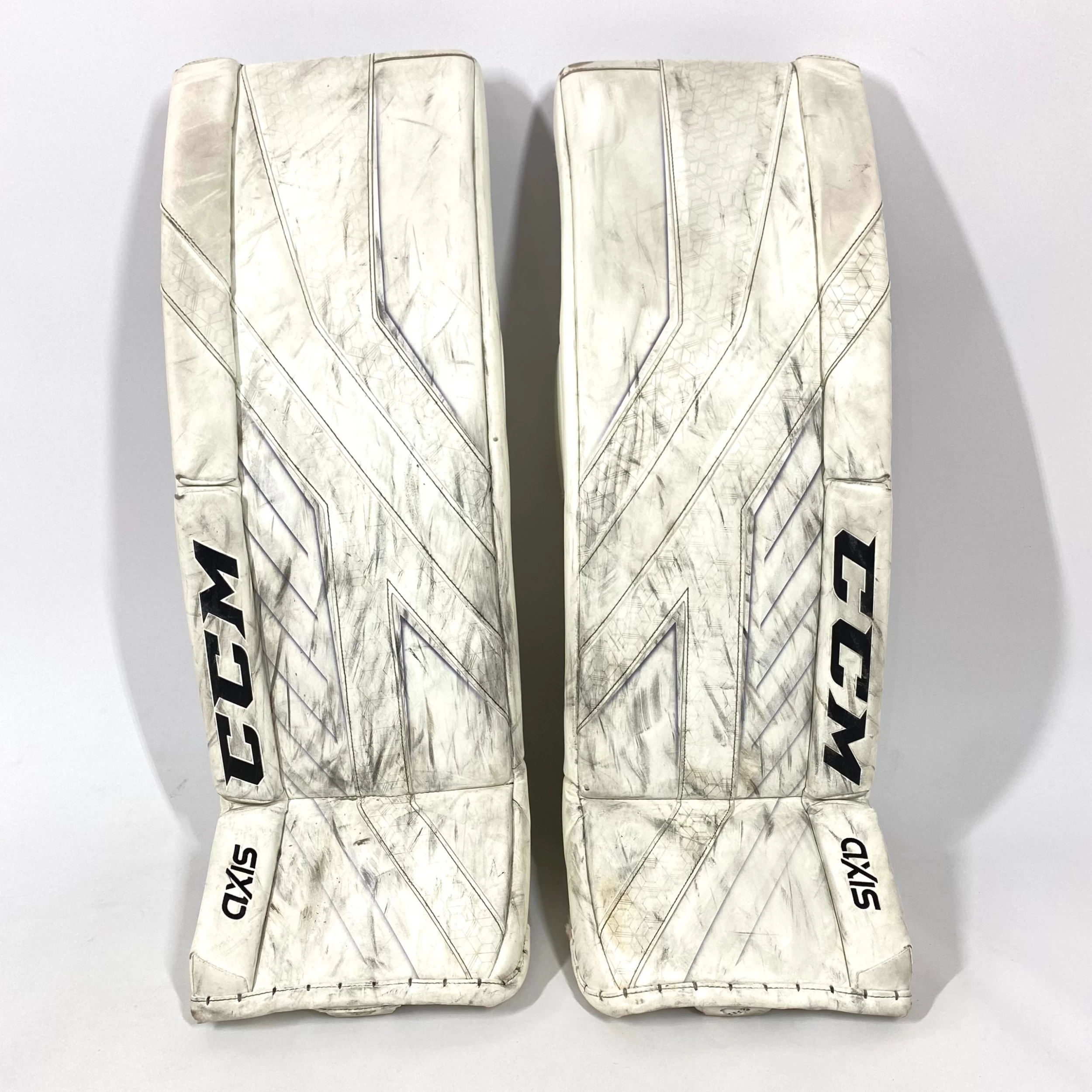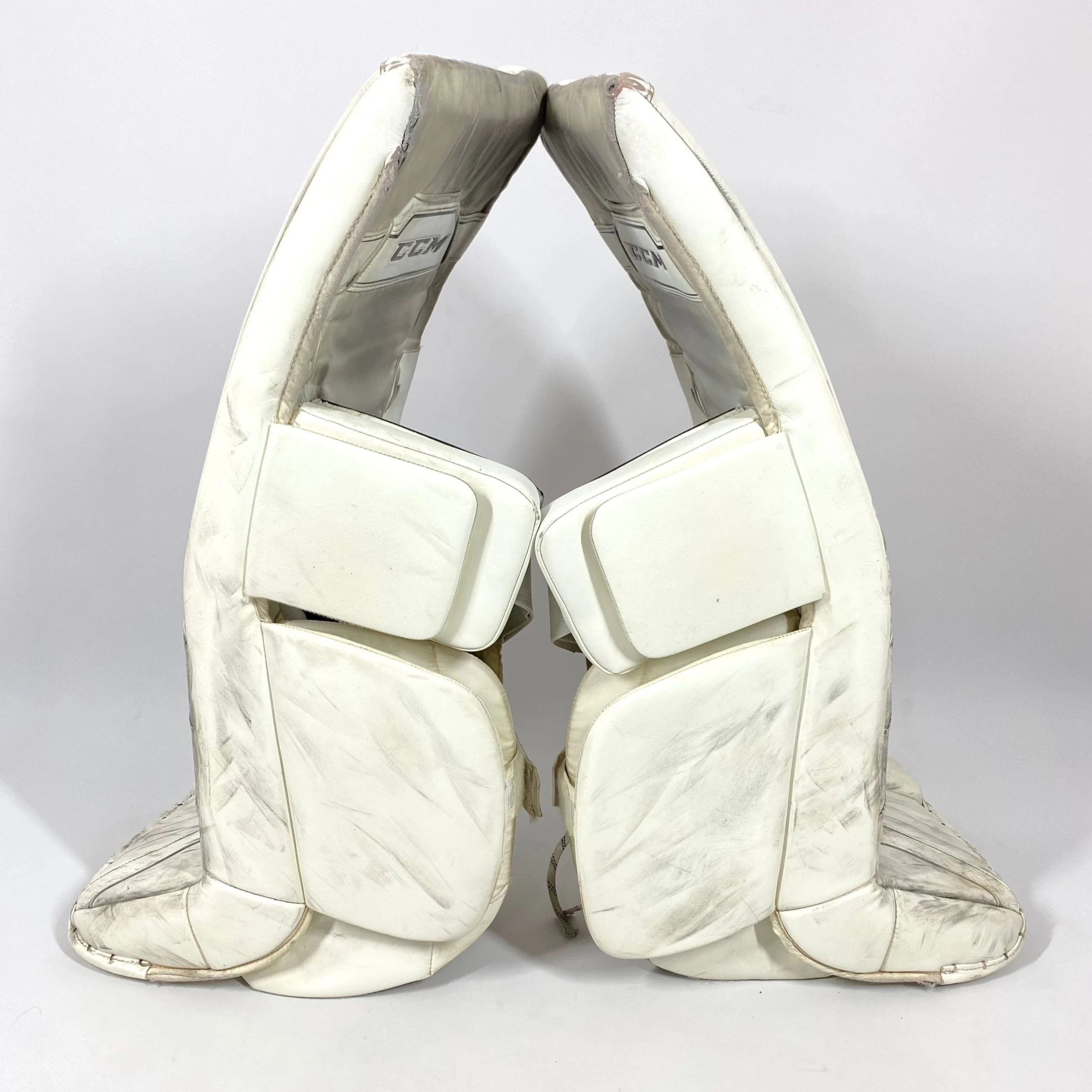 These pads are in excellent used condition with only a small rip on the right pad at the end of the boot into the ankle. All straps work as intended. These are a retail set of pads but were sourced from a pro teams locker room. Other than some general wear and puck marks there are no major areas for concern.Â