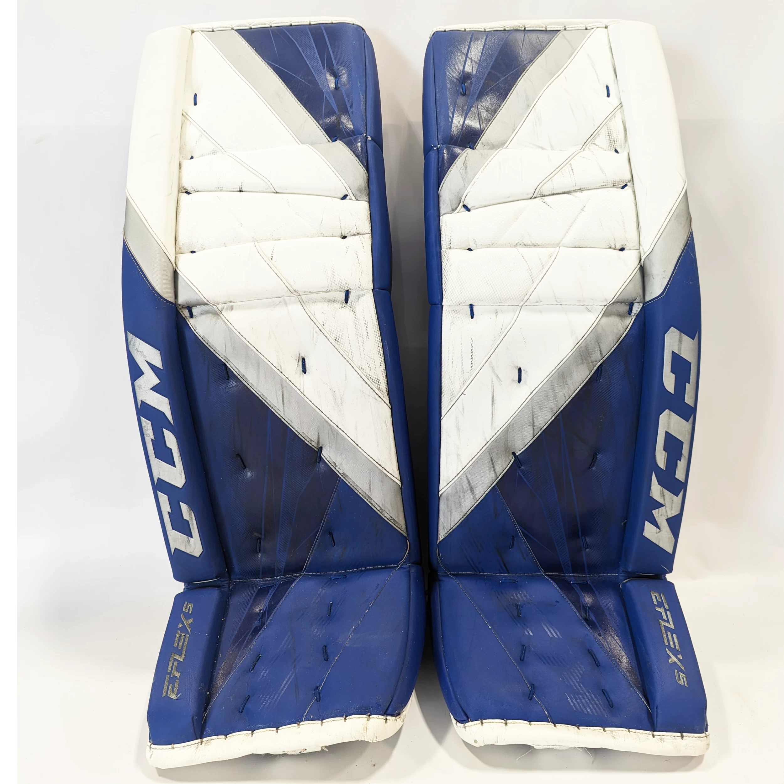 Extreme Flex 5 goalie leg pads in used condition with a few cracks in the leather. There is is also a small amount of adhesive on each boot, which is likely left over from a repair. There is general wear and puck marks. All straps are in working condition, despite evidence of peeling.Â