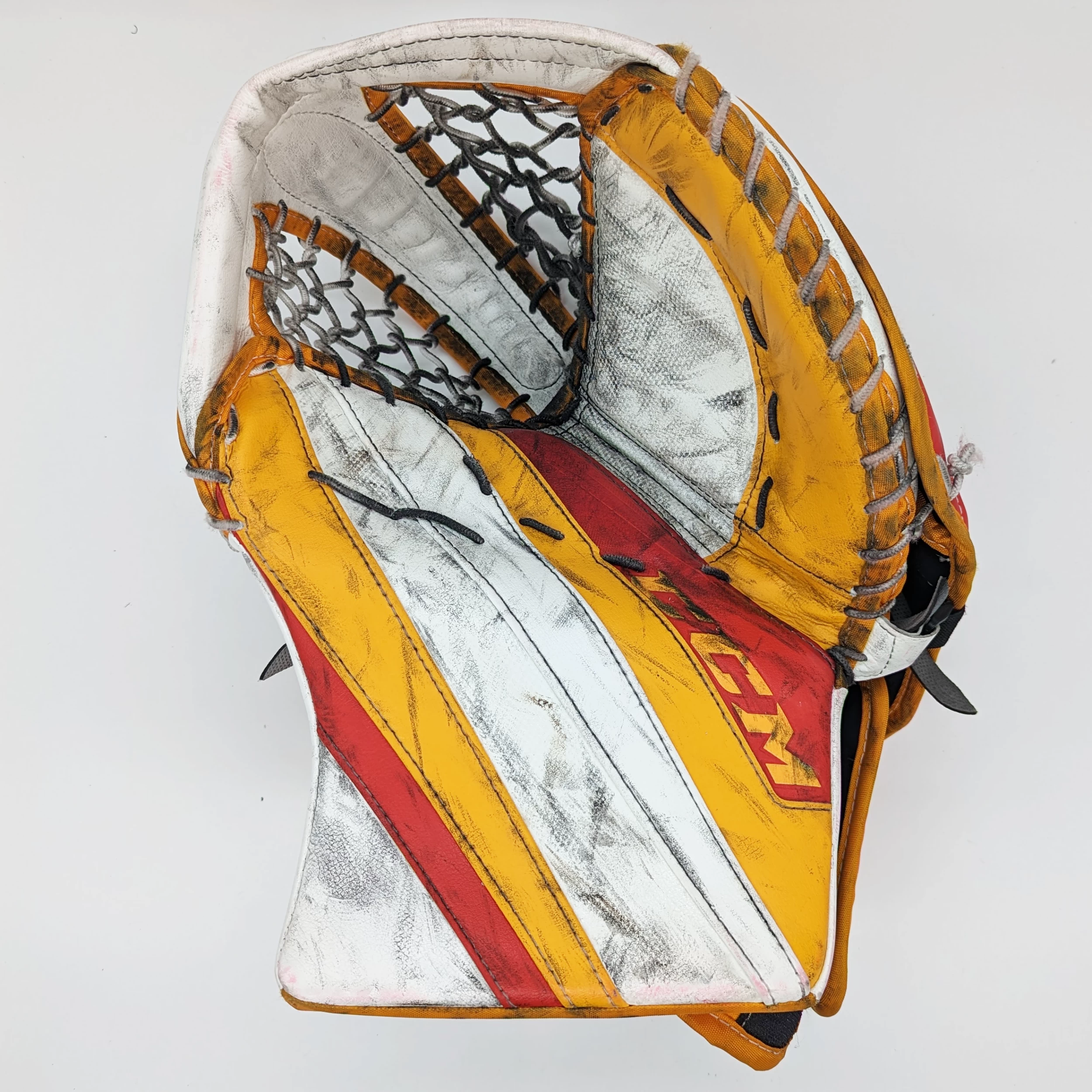 Used CCM Extreme Flex 5 regular goalie glove sourced from the Stockton Heat.Â