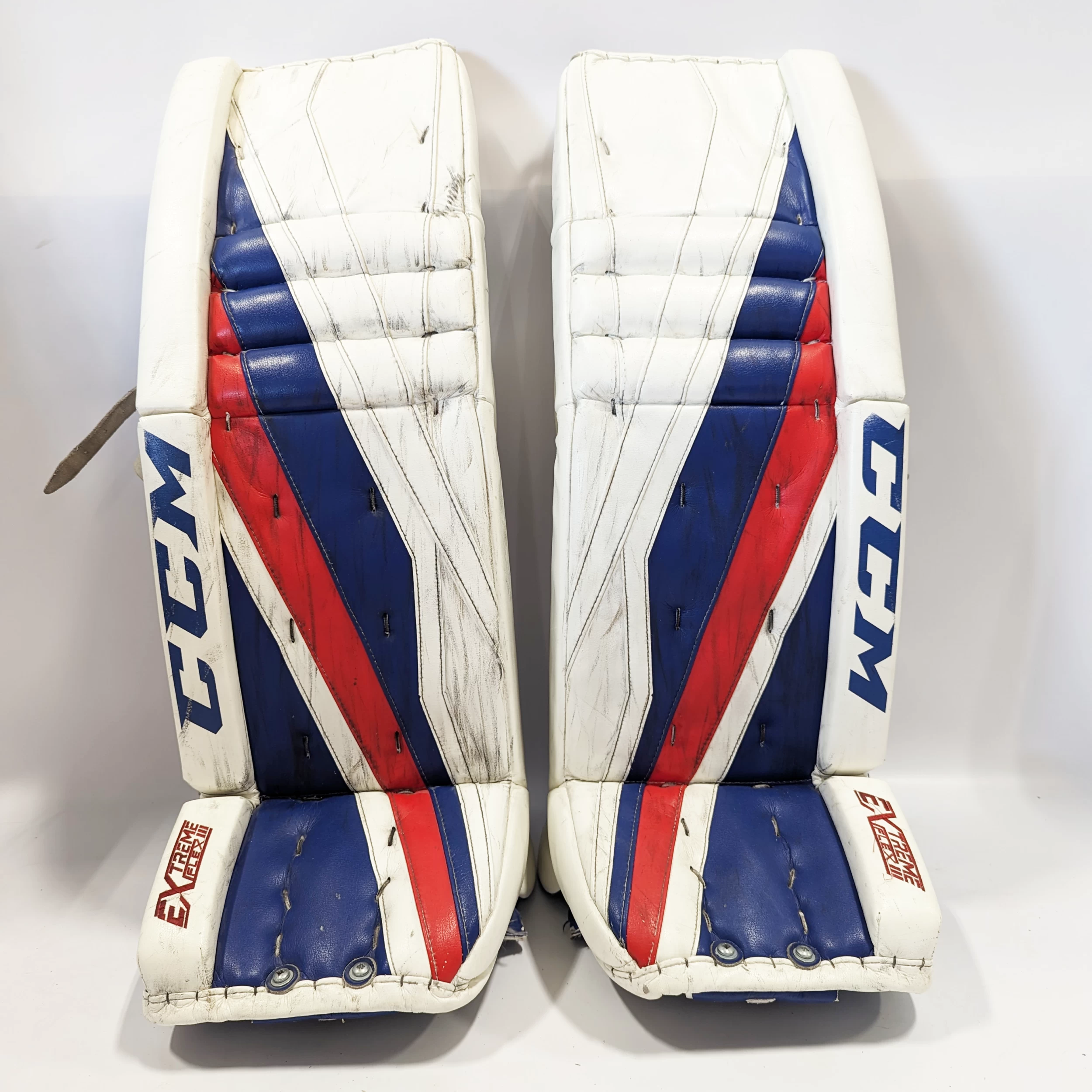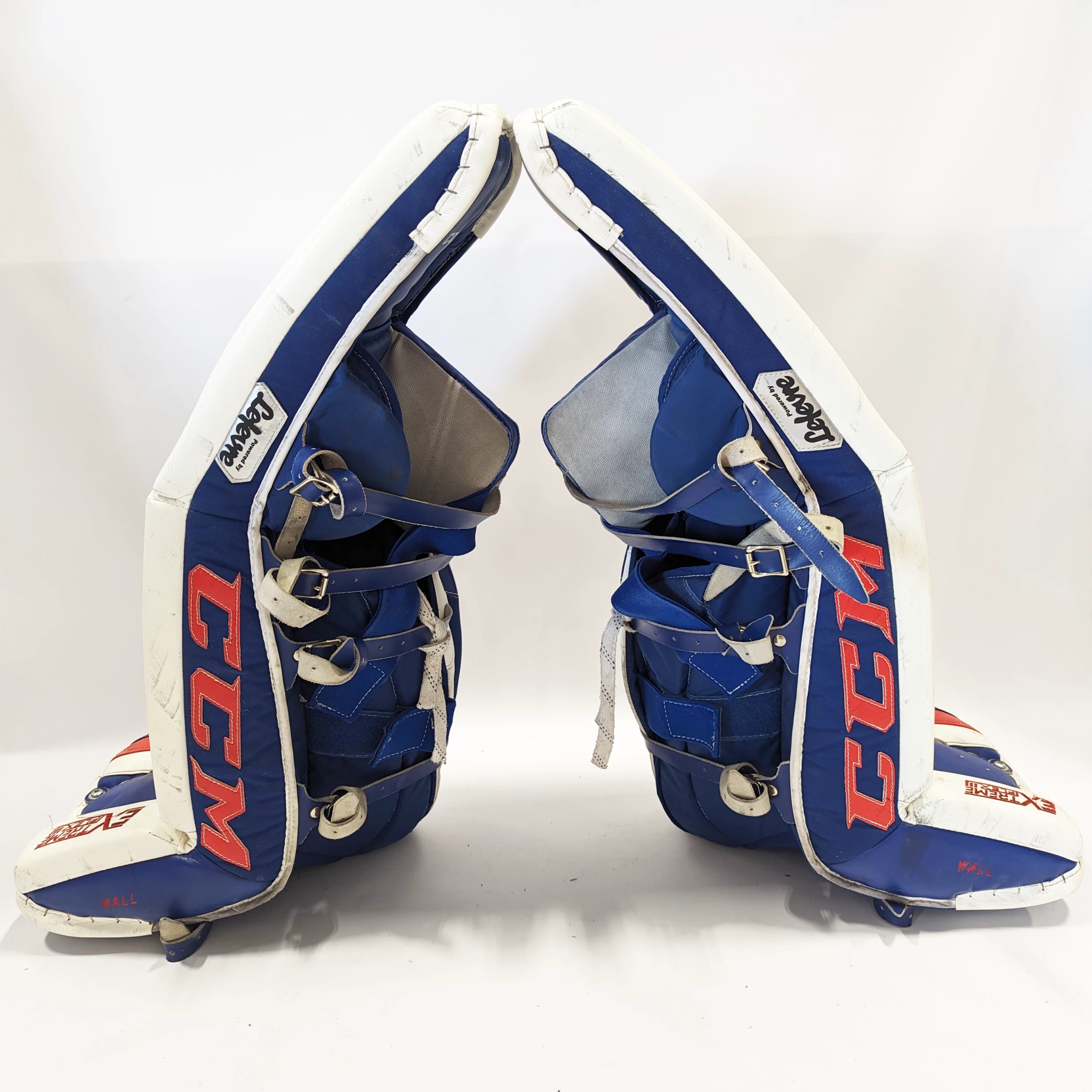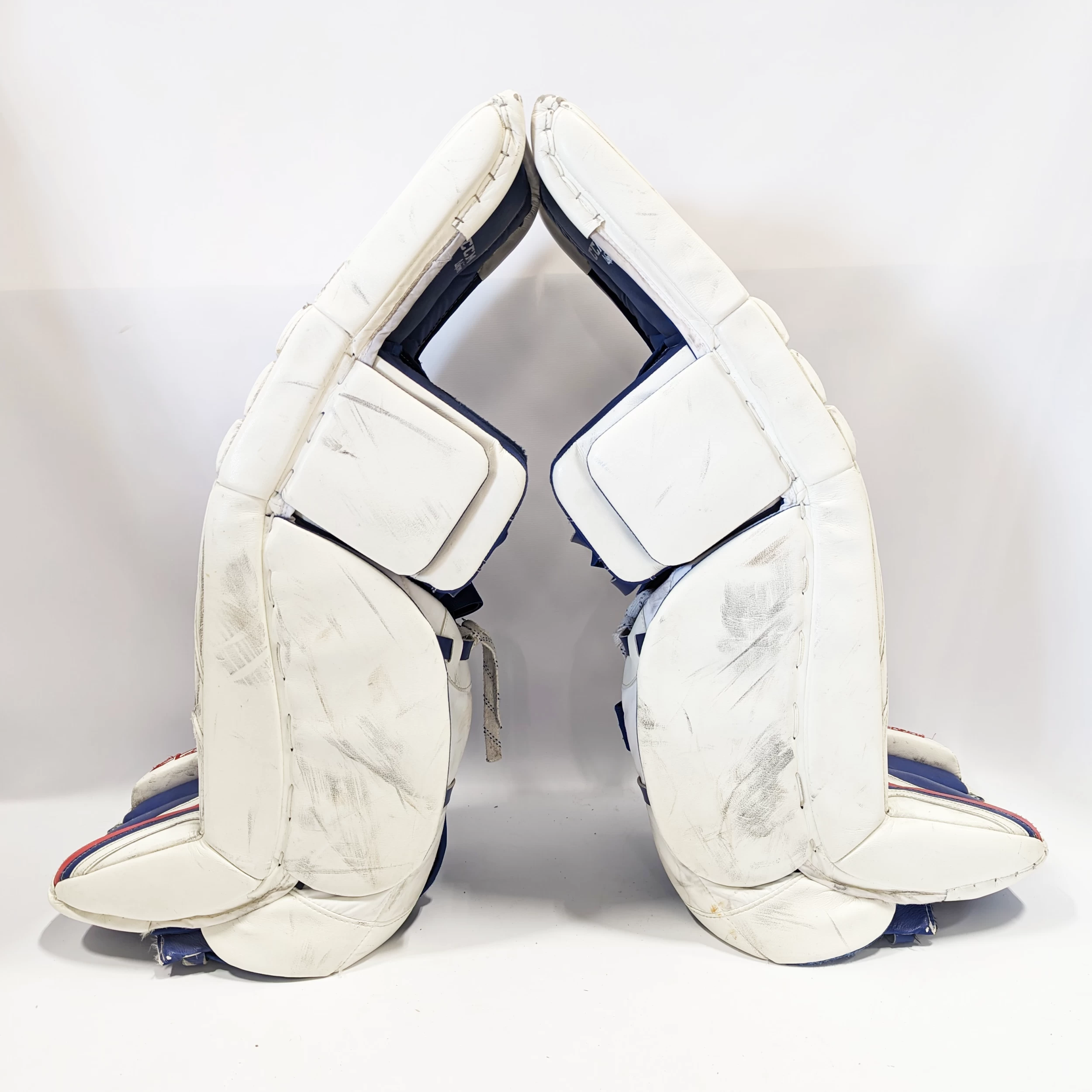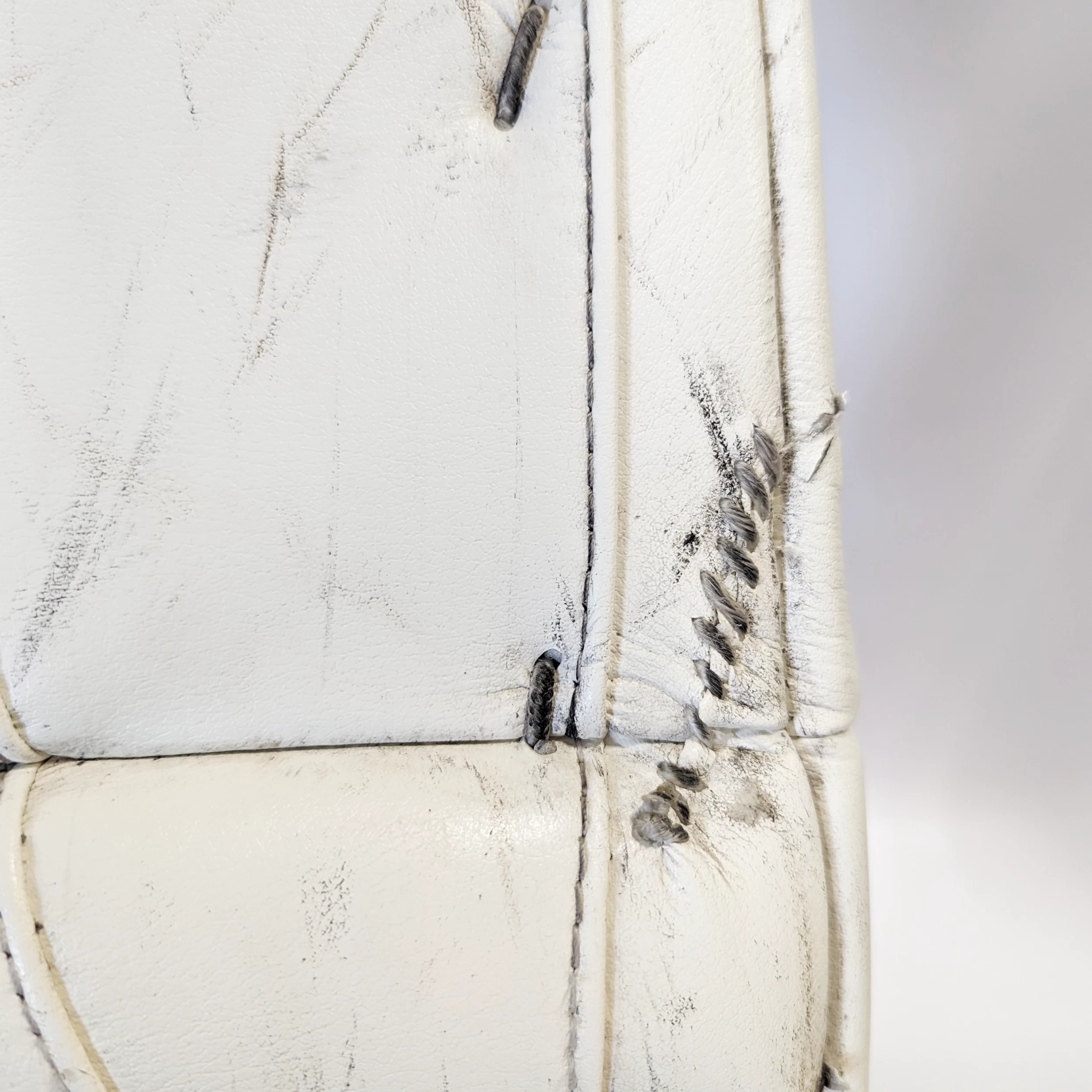 This is a set of used pro stock goalie pads in very good condition. The only sign of concern is a stich job in the upper inside of the right pad (Pictured). Otherwise, there is little signs of wear in the leather and only light puck marking.Â