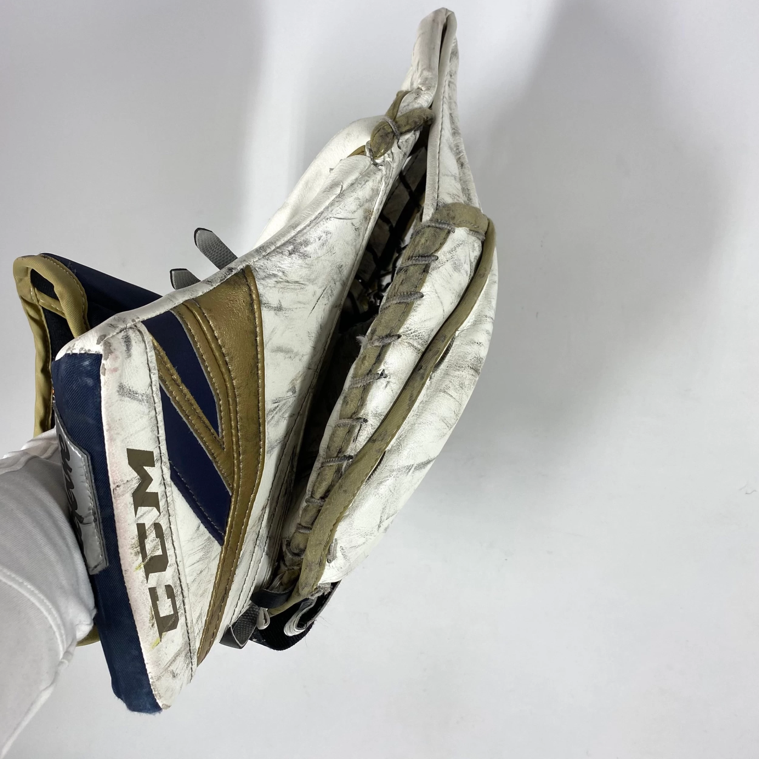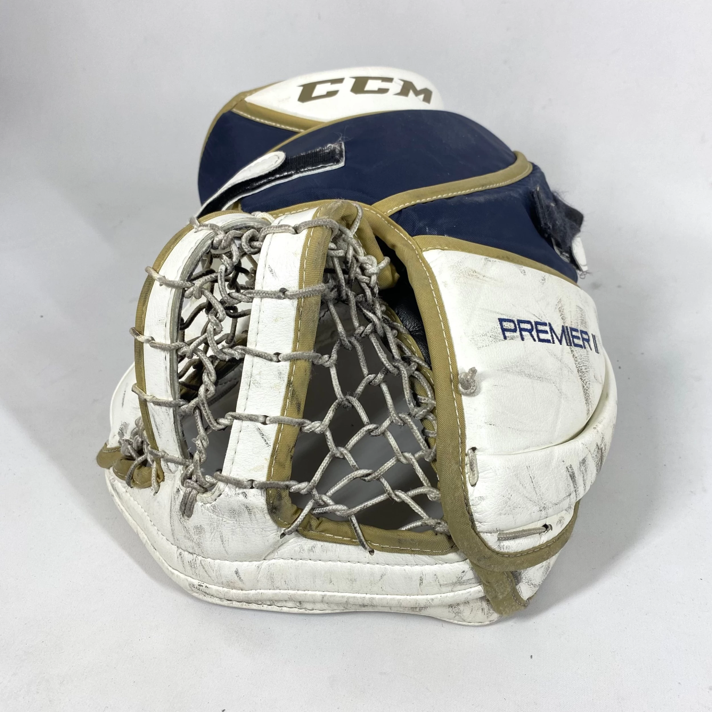 Used CCM Premier II full set from an NCAA team. White/Gold/Blue.