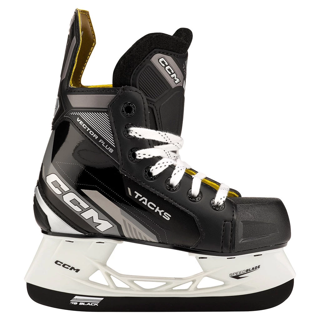 The CCM Tacks Vector Plus 2022 youth skate is an exclusive model that represents an excellent value for the youngest players. Based off the Tacks AS-580 Youth model and delivering very good skating performance, the Vector Plus comes with unique black/chrome/silver graphics which makes them stand out visually from the rest of the 2022 Tacks lineup. Custom color decals allow young skates to match their team uniform or add their own style to their skates.