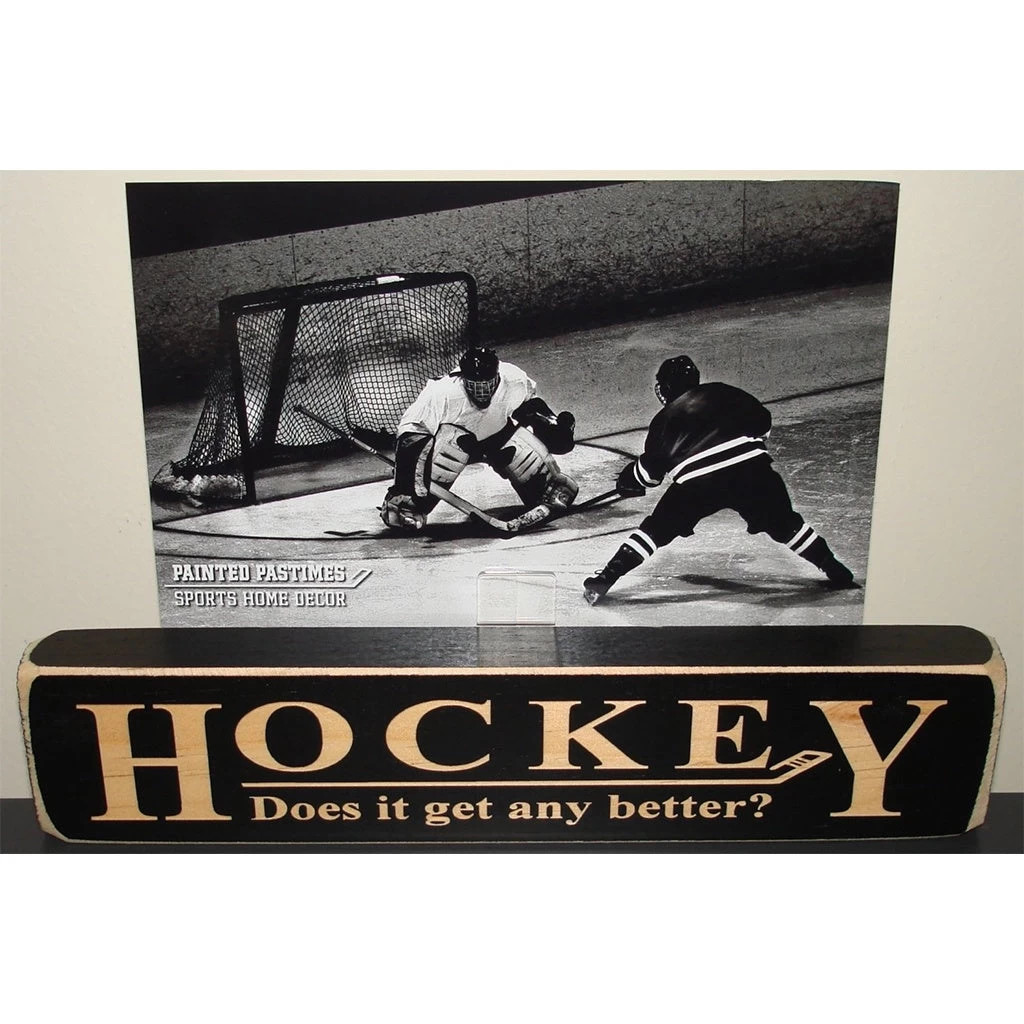“Hockey – Does it get any better?” sign and photo holder. Perfect for anyone who loves hockey! Just replace our photo with yours. Great way to display a special hockey memory while adding a unique conversation piece to any room.