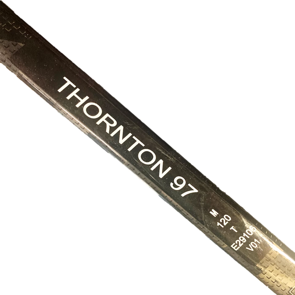 Joe Thornton’s sticks feature a custom long-blade heel curve as well as a variety of custom namebars. Certain variants also include a wooden extension and a white-painted lower shaft.