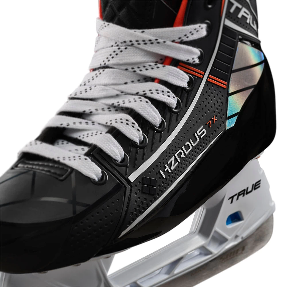 The 7X ice hockey skate is the second model in the 2023 TRUE HZRDUS lineup and delivers best-in-class fit with superior response for the performance level player with a more aggressive skating style. Evolving from the previous generation TF line, the new HZRDUS line features a stiffer shell and delivers a mix of power, response and control. Incorporating thermoformable materials and patented NEUROFIT+ shell design, the 7X offers a stiffer shell rating and increased durabilty without compromising performance.